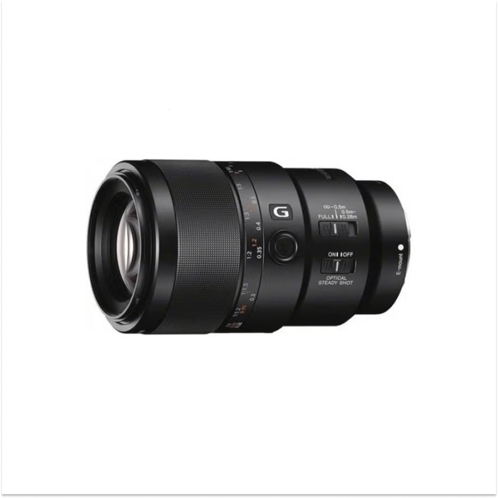 Sony FE 90mm f/2.8 Macro G OSS Lens. Optimized for macro shooting, this medium telephoto lens utilizes an aspherical element along with extra-low dispersion and super extra-low dispersion glass in order to create sharp imagery with minimal aberration. Also, it has a Nano AR Coating that suppresses reflections and allows for efficient light transmission for clear photographs. Its maximum aperture of f/2.8 is effective when shooting in low light and allows for shallow depth-of-field focus. An internal focus system in which only the middle optical groups move when focusing provides fast autofocus action and a short minimum focus distance of 11″. Also, the lens does not extend when focusing and the front end does not rotate. The Direct Drive Super Sonic Wave AF motor employs piezoelectric elements oscillating at ultrasonic frequencies to drive the focus lens with accuracy and near-silence. The focus ring slides back and forth to select manual or auto focus and with a focus hold button and focus limiter switch, the lens offers precise control of where you place focus. An optical image stabilization system uses gyro sensors to detect camera movement and quiet linear motors to shift the stabilization lens for blur control that is very helpful when shooting macro and/or in low light. Nine circular aperture blades create a unique diaphragm design that is almost perfectly circular throughout its aperture range and thus helps to create pleasing out-of-focus highlights. Finally, a handsome and sturdy build with a dust and moisture resistant design contributes to the overall quality and durability of this fine optic.