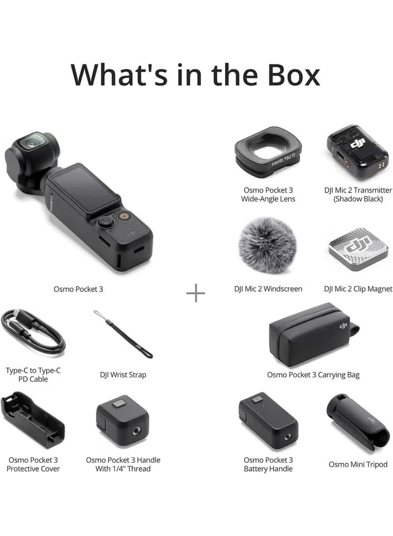 - Includes Osmo Pocket 3 starting set, the DJI Mic 2 Transmitter, battery handle, Osmo mini Tripod, and more. Take filming a step further with extended battery life and elevated audio. An essential for any content creator