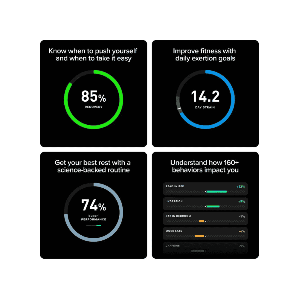 Comprehensive App Dashboard: Gain deep insights into your strain, sleep efficiency, and recovery trends.
